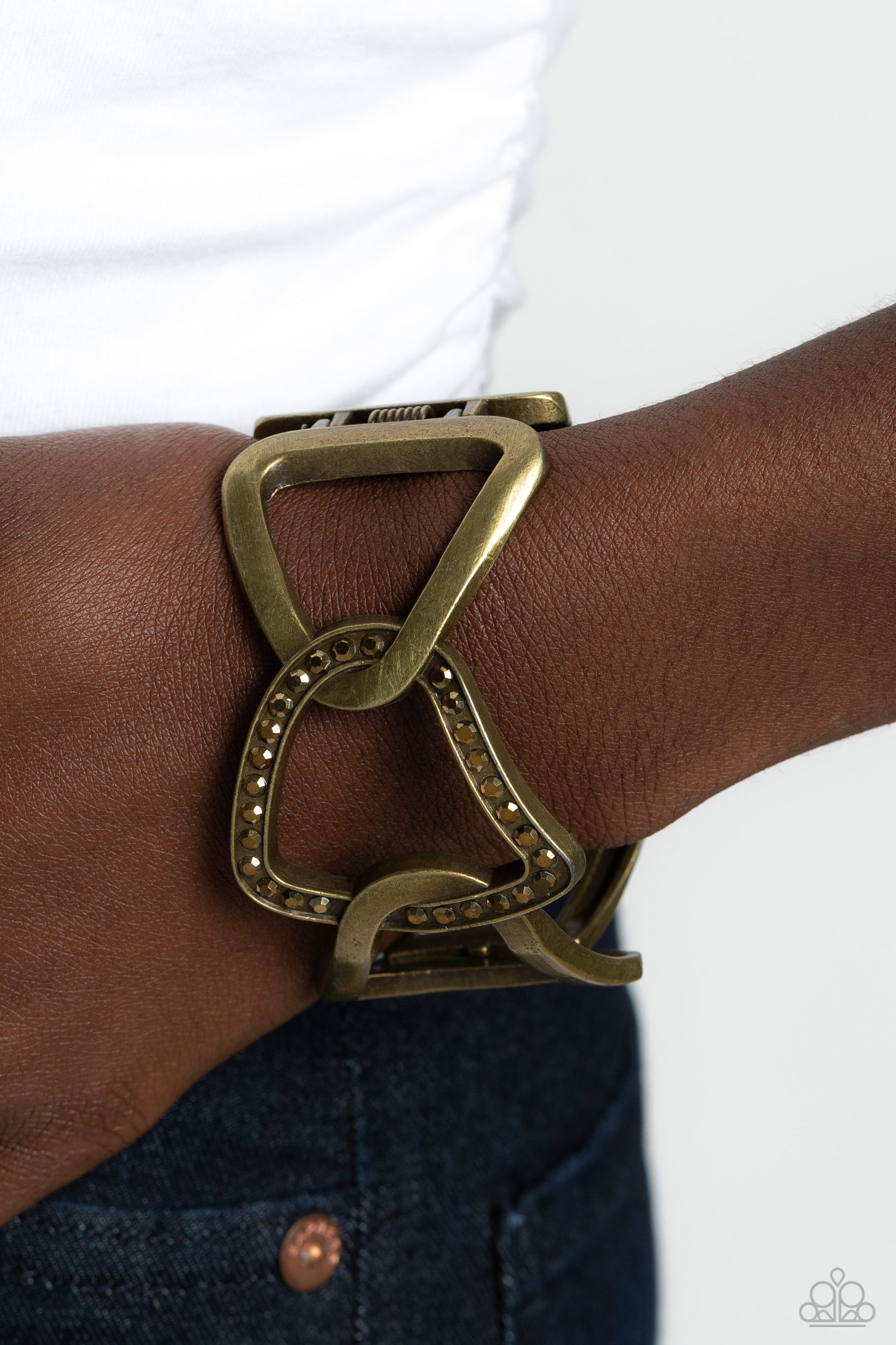 Brass ovals bent into an abstract shape interlock around one another around the wrist. Featured on a solitaire abstract oval, a border of aurum rhinestones stands out for an understated shimmer. Features a hinged closure.