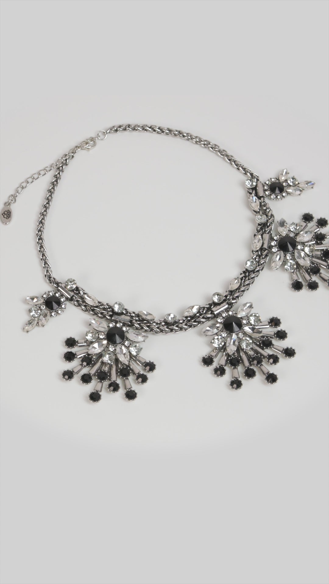 A thick silver chain gives way to an ornately woven band of silver along the neckline, creating a bold braid. Sporadically dotted atop the cording, white round and marquise-cut gems alternate above a collection of flared frames, adding a bit of lively dazzle. Clusters of black defaced gems, emerald-cut silver bars, round white rhinestones and gems, and marquise-cut white gems gradually increase in resplendence and radiance along the center of the design, creating an art-deco-inspired fringe of uncompromising sparkle. Features an adjustable clasp closure.