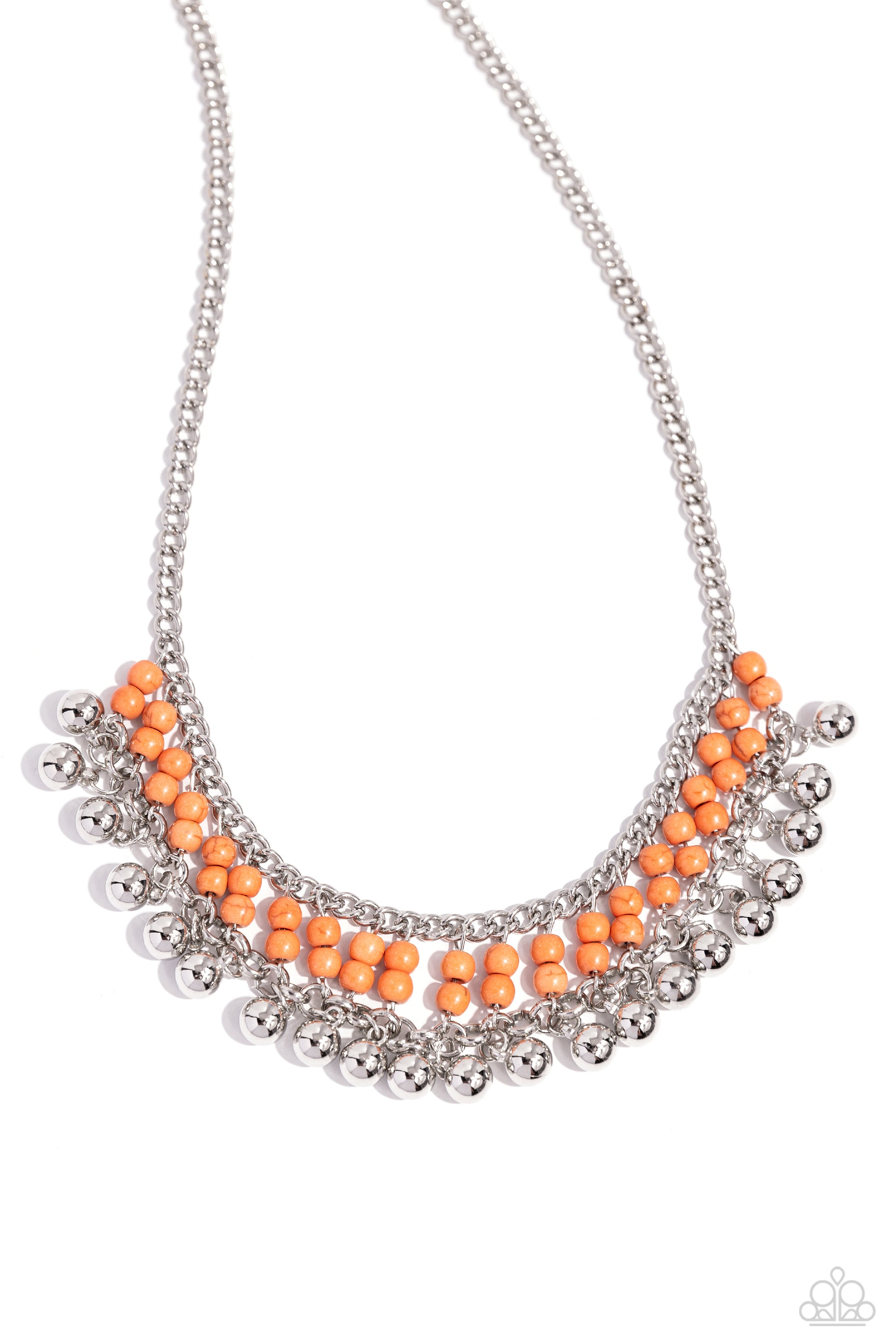 Threaded along dainty silver rods, stacks of refreshing orange stone beads give way to a row of shiny silver beads, creating an earthy fringe below the collar. Features an adjustable clasp closure.