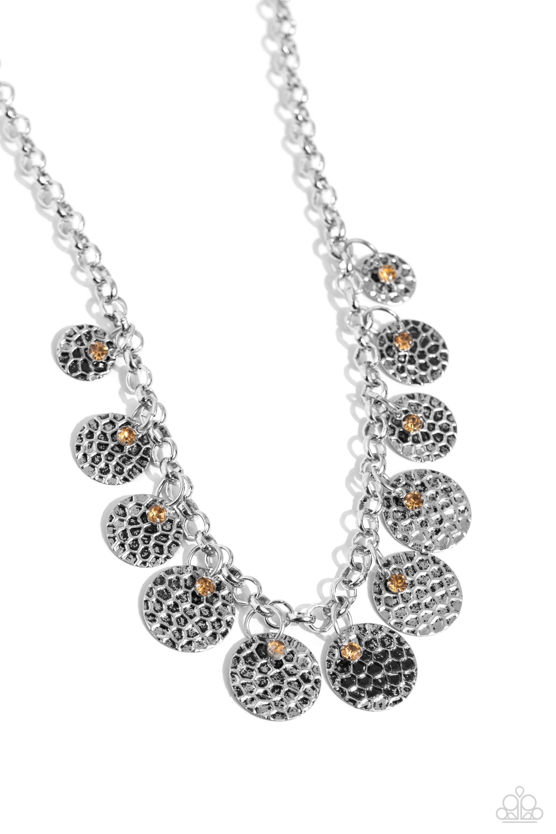 Antiqued silver discs hammered with a dappled design, dangle delightfully across the collar from a silver chain. Dainty topaz rhinestones dance in front of each disc for a collision of flirtatious earthiness. Features an adjustable clasp closure.