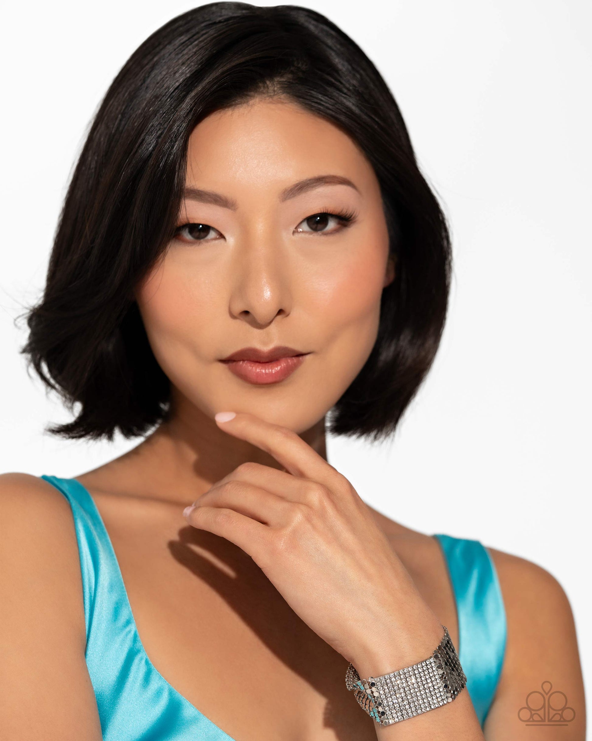 Attached to silver horizontal fittings, copious strands of silver sequins flicker and flash along the wrist. Featured in the center of the design, a white rhinestone-encrusted elongated square pendant glitters for additional eye-catching shimmer and detail. Features an adjustable clasp closure.