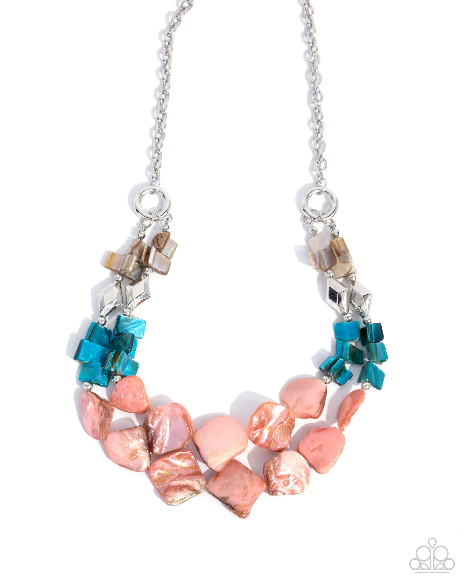 Tiers of chiseled natural brown, turquoise, and coral shells give way from a duo of silver rings connected to a silver cable chain, creating a cascading complementary ombre effect below the collar. Additional dainty silver accents and faceted silver diamond-shaped beads are interspersed along the design for a dynamic finish. Features an adjustable clasp closure.