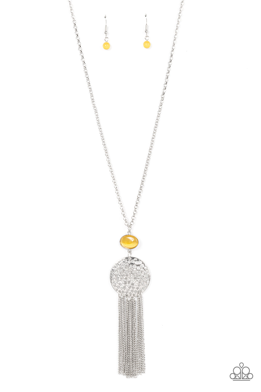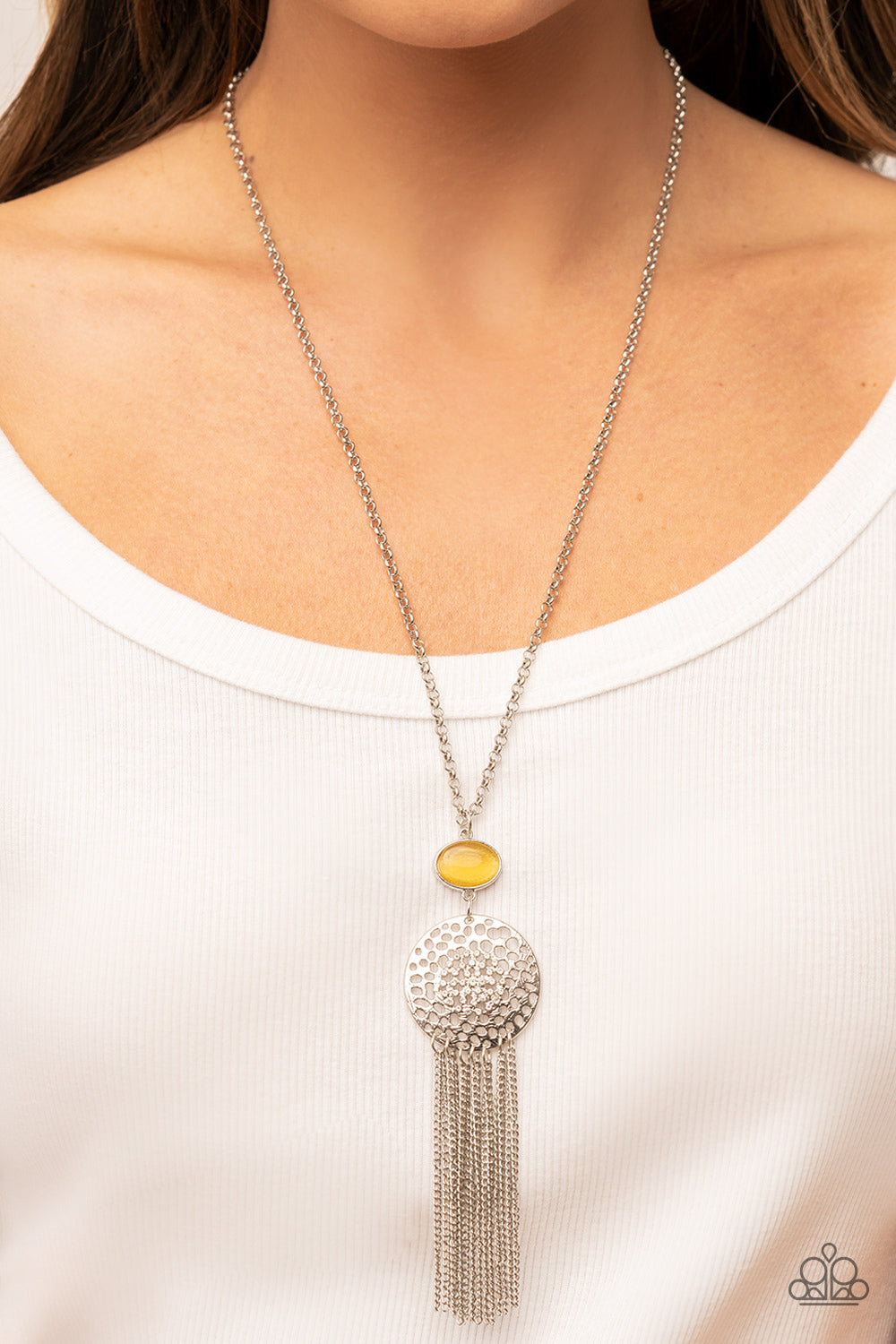 Dainty white rhinestones are sprinkled across the center of a silver disc featuring abstract circular cutouts. Infused with a shimmery silver chain tassel, the airy silver medallion is suspended from a glassy yellow cat's eye frame at the bottom of an extended silver chain for a whimsical finish. Features an adjustable clasp closure.