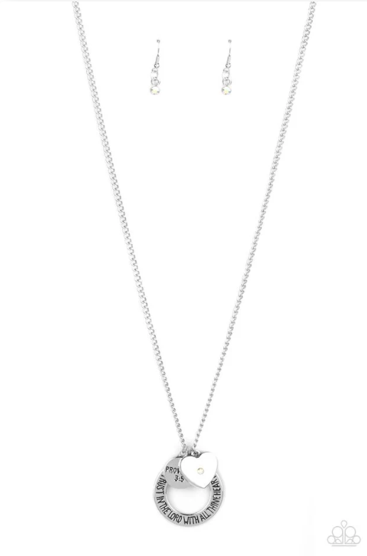 Dotted with a sparkly iridescent rhinestone, a dainty silver heart joins a silver ring stamped in the biblical passage, "Trust in the Lord with all thine heart," and a silver disc stamped in, "Proverbs 3:5," along the bottom of a lengthened silver chain, creating an inspirational pendant. Features an adjustable clasp closure.