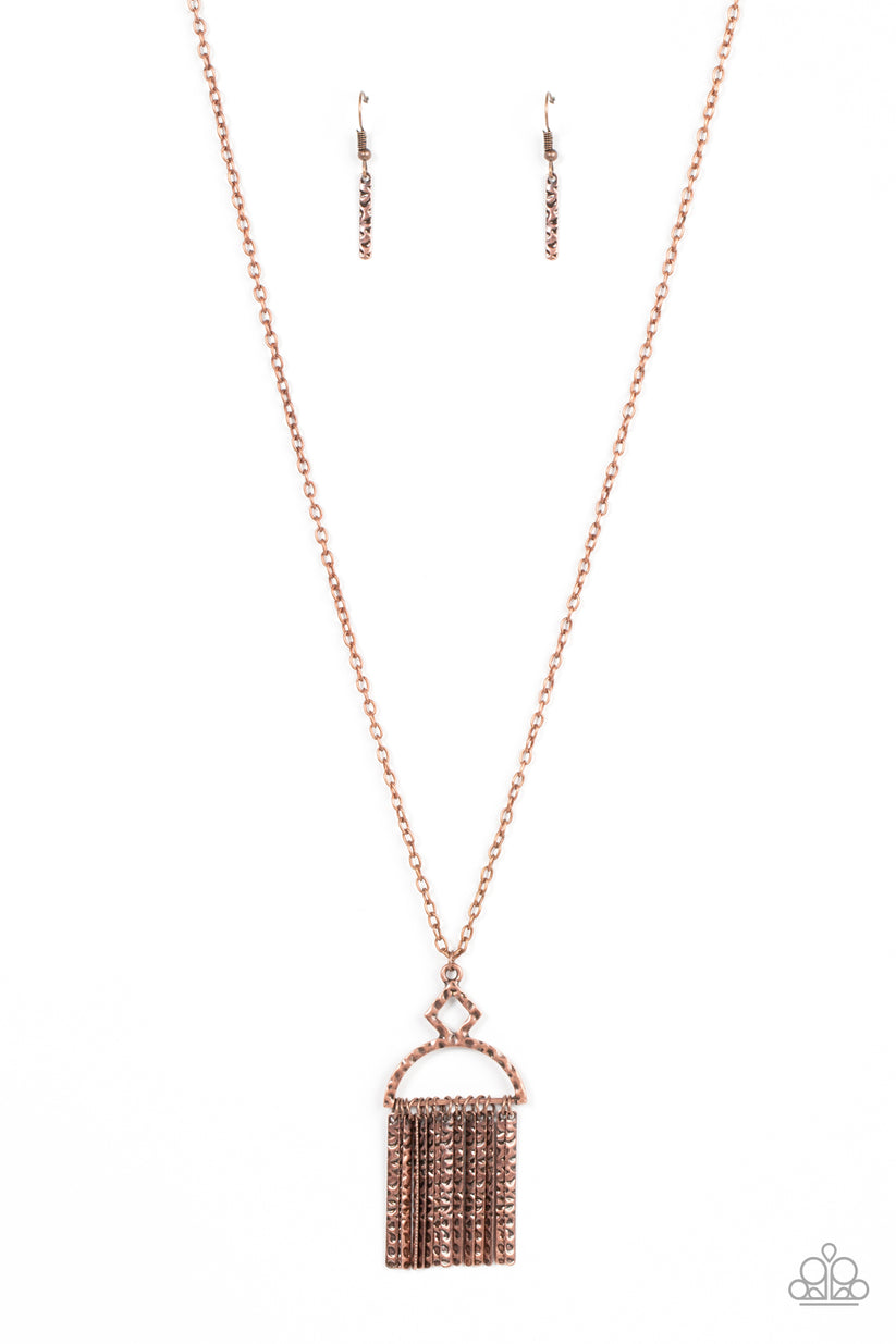 A rustic fringe of hammered cooper pendulums swings from the bottom of a hammered geometric pendant. The half moon-like pendant swings from the bottom of an extended copper chain, creating a noisemaking tassel. Features an adjustable clasp closure.