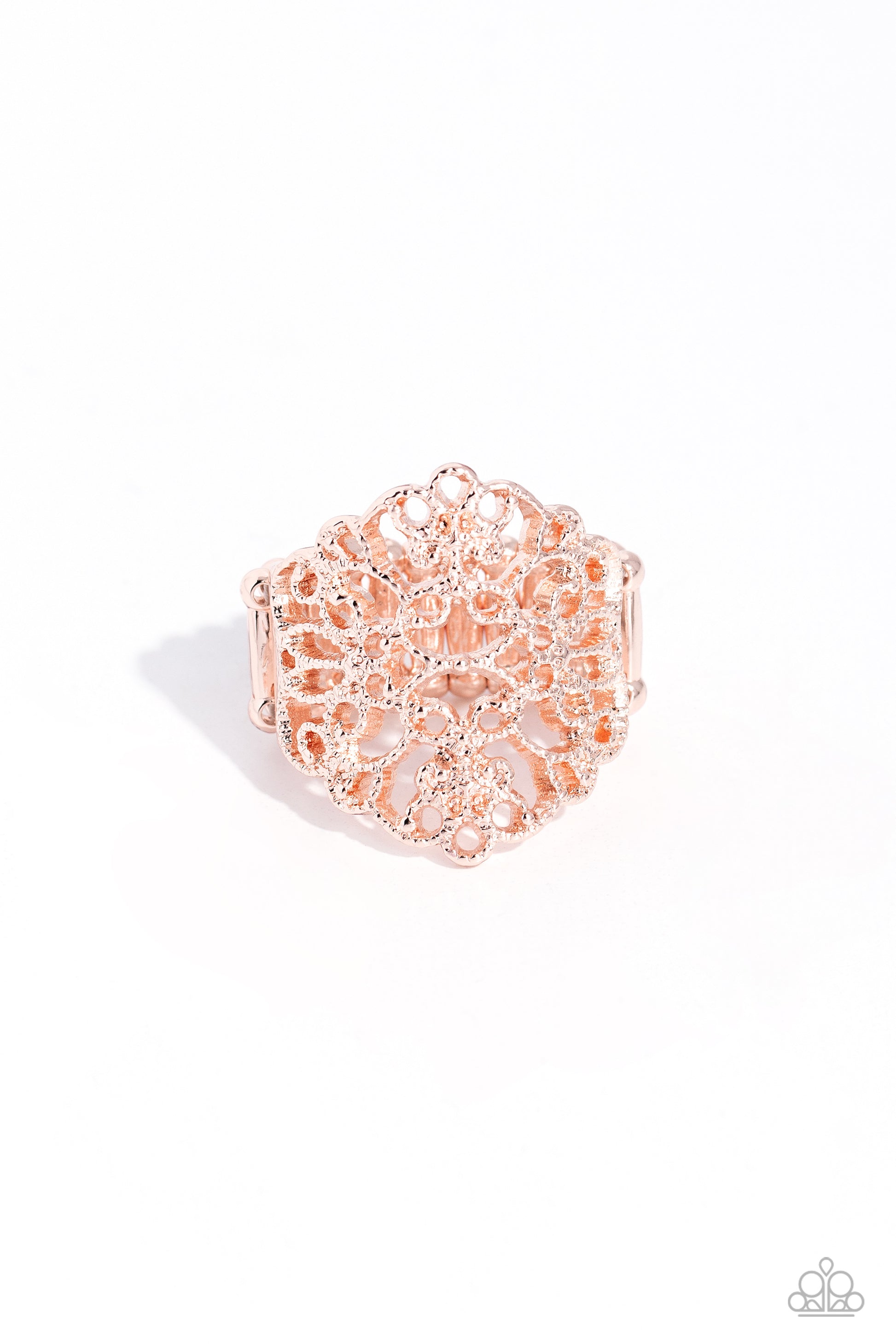 Brushed in a studded shimmer, glistening rose gold floral filigree vines across the finger for a seasonal look. Features a stretchy band for a flexible fit.
