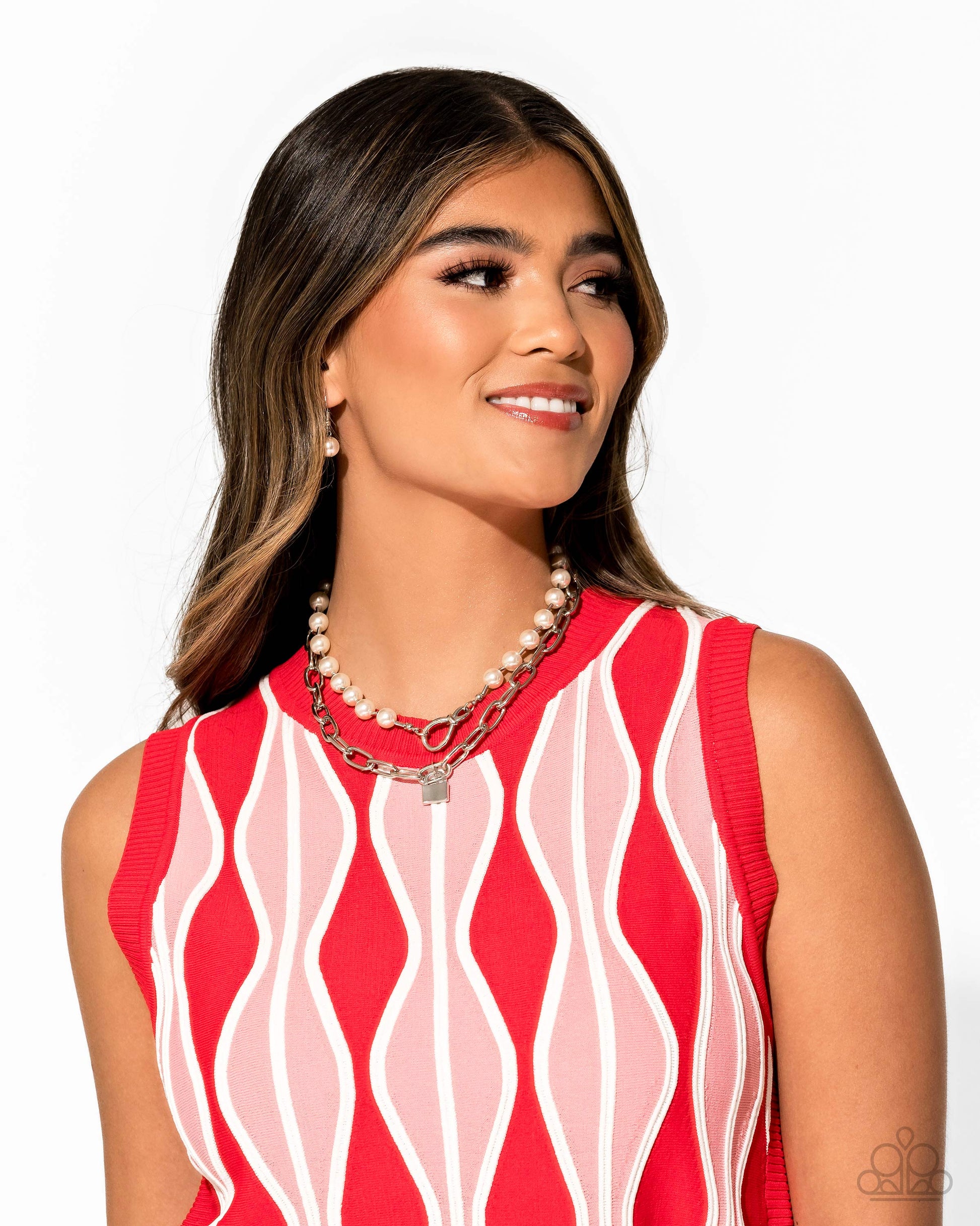 Connecting to a strand of glossy white pearls, a silver paperclip chain cascades below the neckline. An additional strand of glossy white pearls layers above the paperclip strand, connecting to a silver clasp closure at the middle of the design. A silver padlock charm dangles from the lowermost strand for an industrial finish. Features a lobster clasp closure.