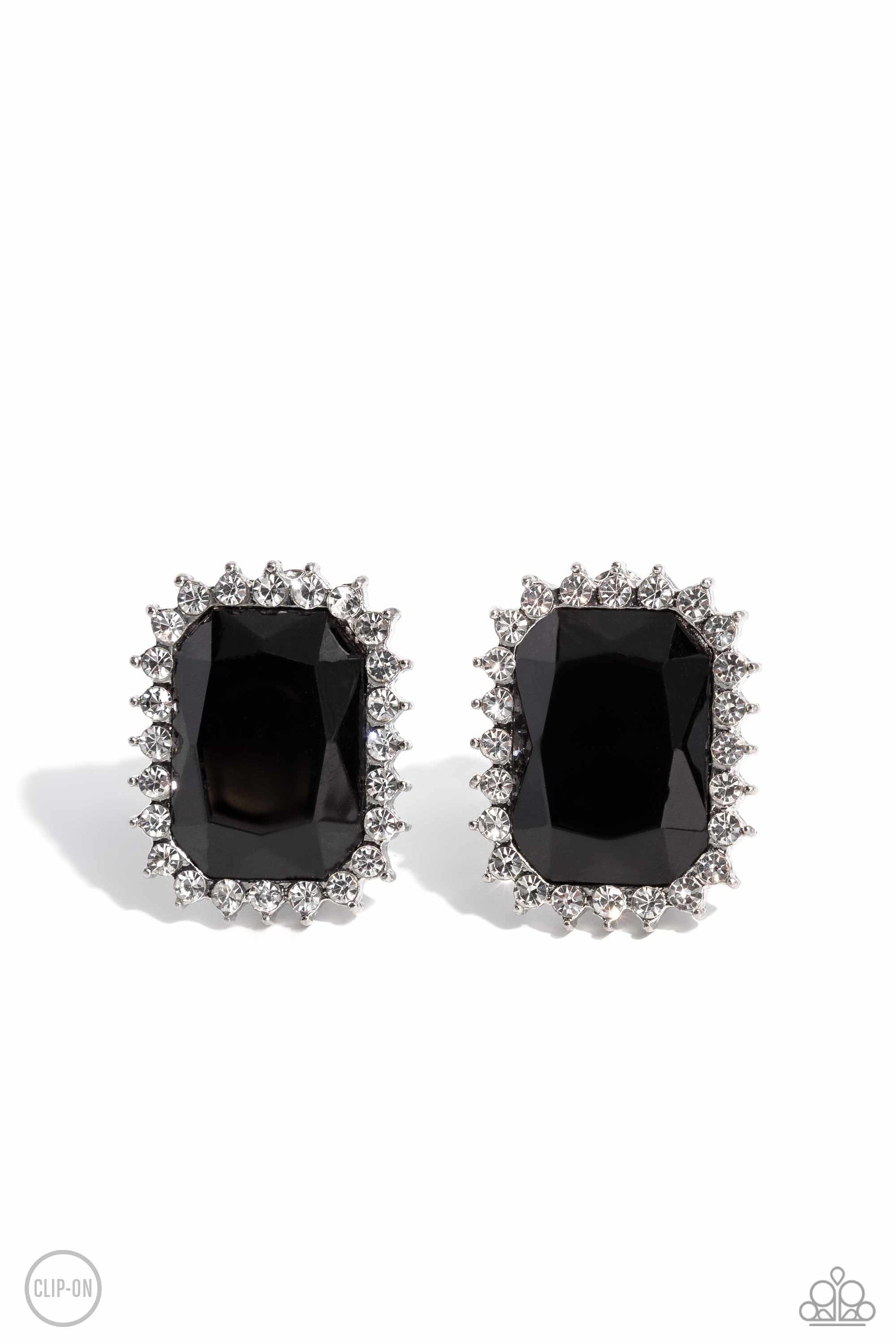Featuring a regal emerald style cut, a dramatic black gem is pressed into the center of a silver frame radiating with glassy white rhinestones for a show-stopping look. Earring attaches to a standard clip-on fitting.