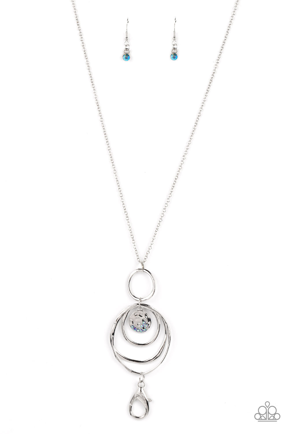 A trio of mismatched warped silver rings swings from the bottom of a glistening silver ring connected to a chain in the same hue, creating an asymmetrically stacked pendant. A hammered silver disc with speckles of dainty blue iridescent rhinestones swings in the center of the warped rings, adding a dash of enchanting sparkle. A lobster clasp hangs from the bottom of the design to allow a name badge or other item to be attached. Features an adjustable clasp closure. Due to its prismatic palette, color may vary.