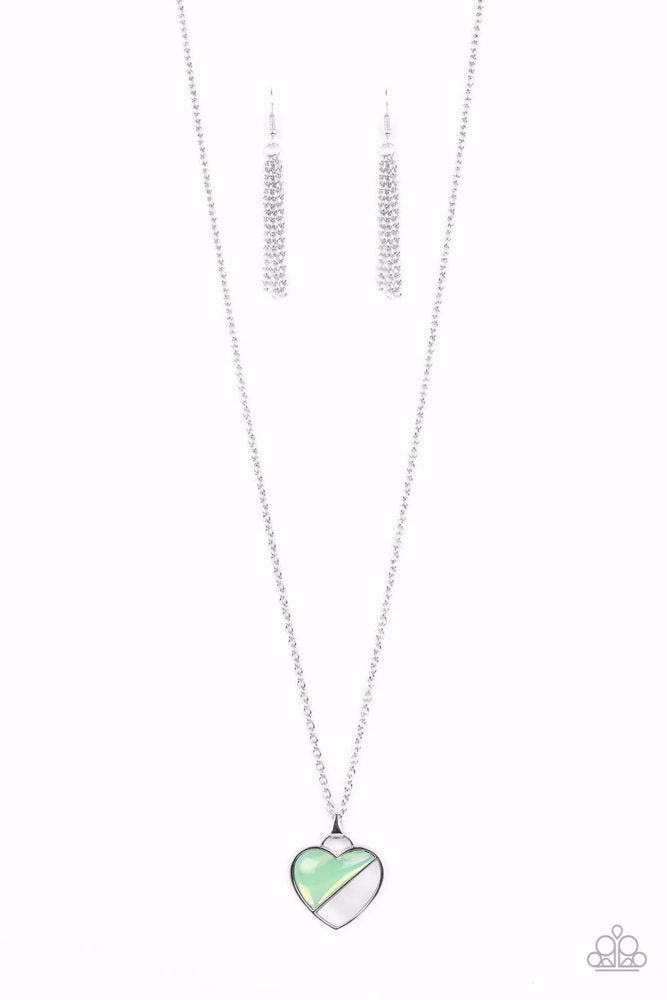 Encased in a silver heart frame, a glassy green bead and white shell-like stone lay side-by-side, creating a romantic pendant at the bottom of a classic silver chain. Features an adjustable clasp closure.