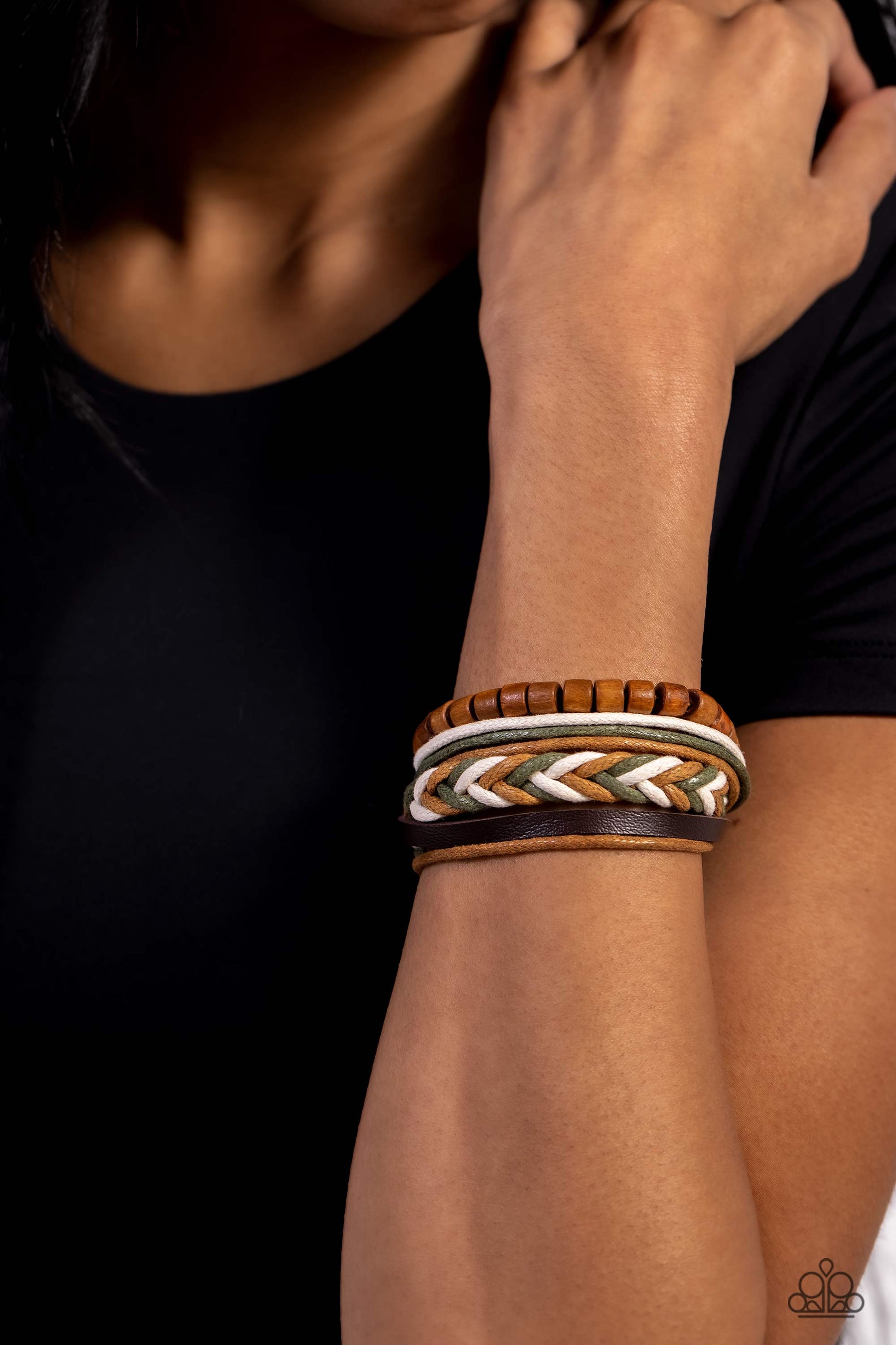 A mismatched combination of wooden beads, a brown leather band, and layers of colorful cording layer across the wrist for a free-spirited finish. Features an adjustable sliding knot closure.