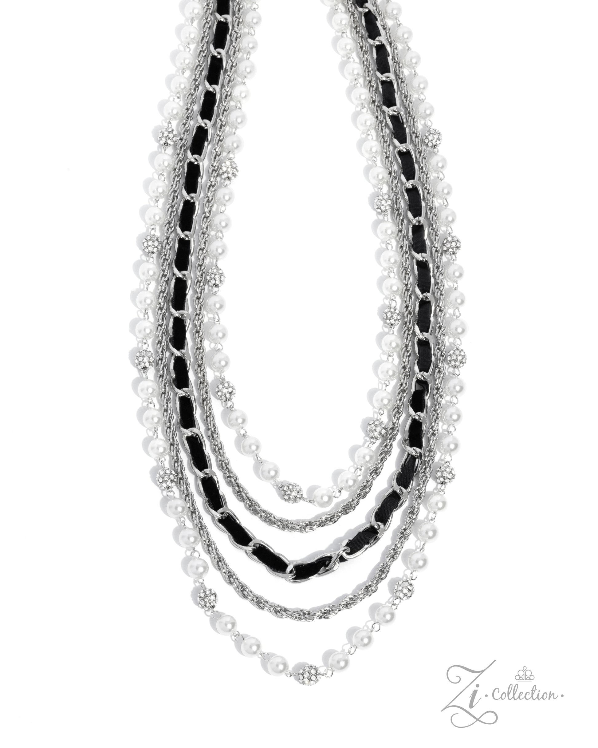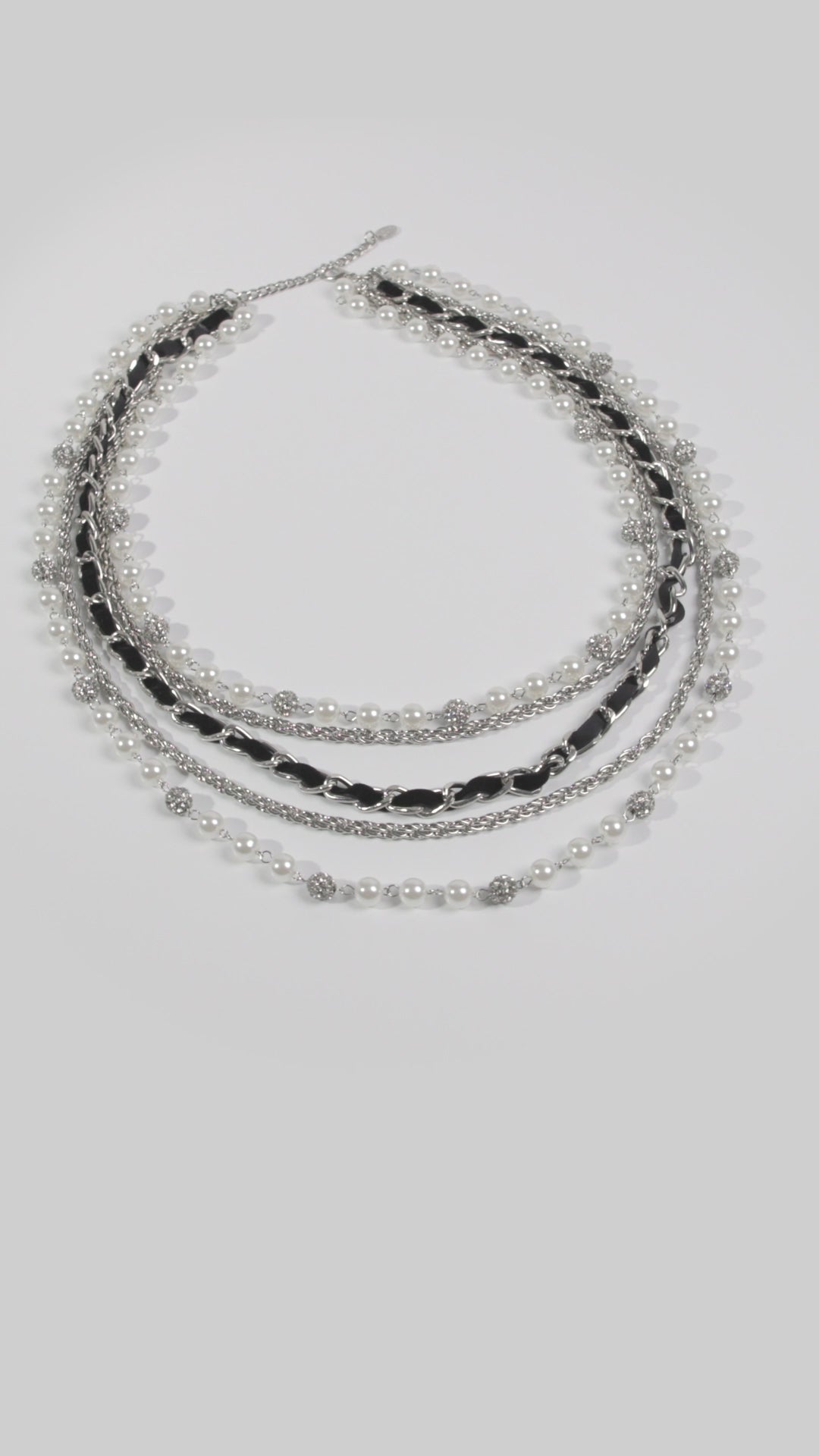 A mismatched collection of silver rope chains is layered with trios of pearls that alternate with white rhinestone-embellished ornament strands to create luminous layers with charismatic confidence. A strand of black velvet ribbon is threaded through a silver curb chain, resting between the sections of the pearly chains, adding dramatic flashes of grit among the mashup of textures. Features an adjustable clasp closure.