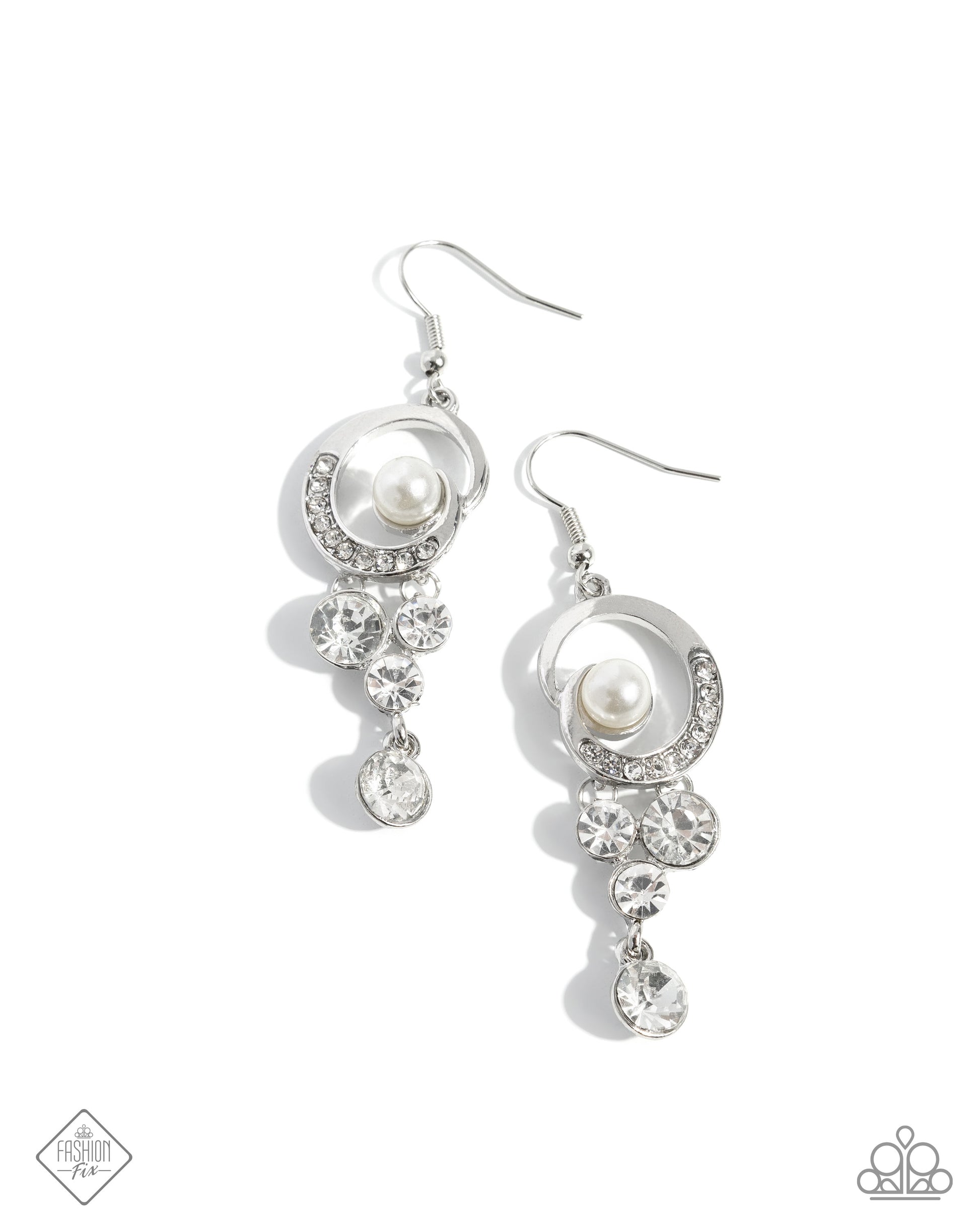 Encrusted in glittery white rhinestones, silver ribbons wrap around a pearly white center in a timeless fashion, giving way to a glittery tassel of white rhinestones in varying sizes for an eye-catching elegant lure. Earring attaches to a standard fishhook fitting.
