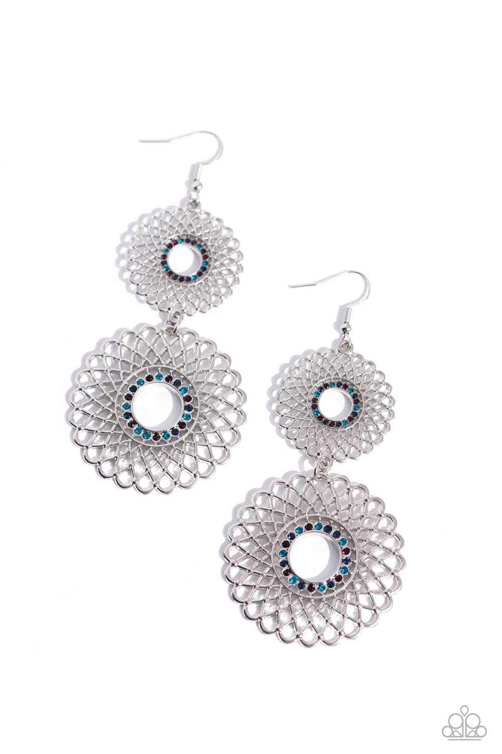 Airy silver petals infinitely overlap into two dizzying silver floral medallions. Rings of dainty multicolored rhinestones adorn the center, adding a dash of dazzle. Earring attaches to a standard fishhook fitting.