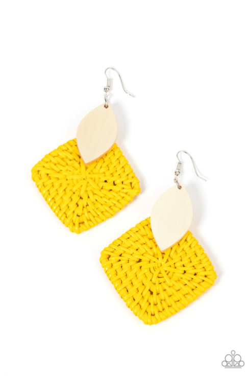 A leaf shaped white wooden frame delicately overlaps with an intricately woven Illuminating wicker-like frame, creating a sunny pop of color. Earring attaches to a standard fishhook fitting.