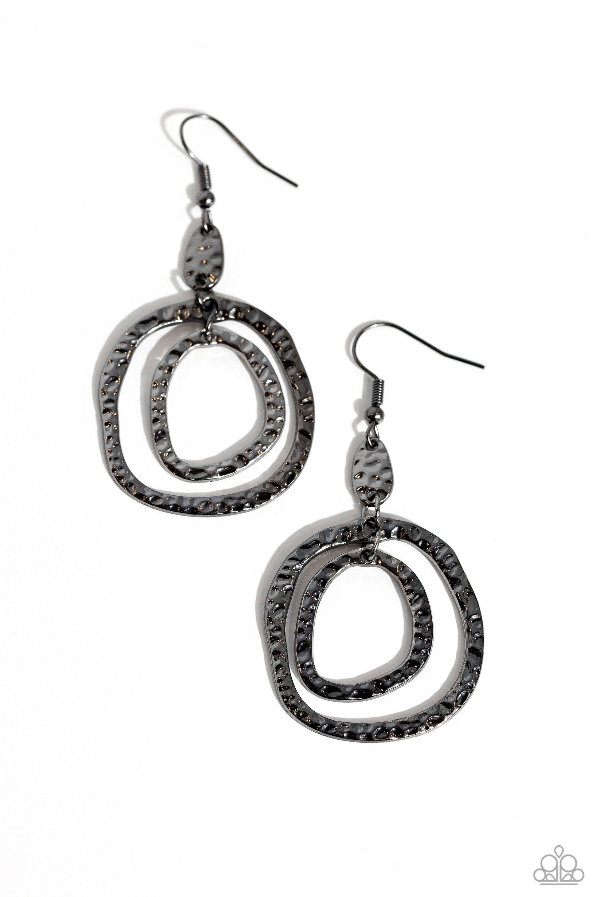 Hammered in shimmery textures, a pair of asymmetrical gunmetal hoops cascade from the bottom of a matching hammered fitting for an edgy vibe. Earring attaches to a standard fishhook fitting.