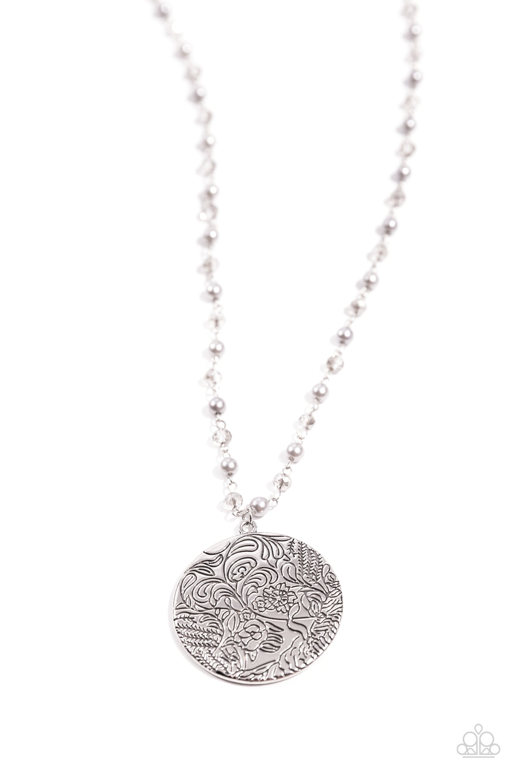 Stamped in a floral motif, an oversized silver medallion blooms from the bottom of an extended silver chain adorned with silver pearls and smoky crystal-like beads for a whimsical flair. Features an adjustable clasp closure.