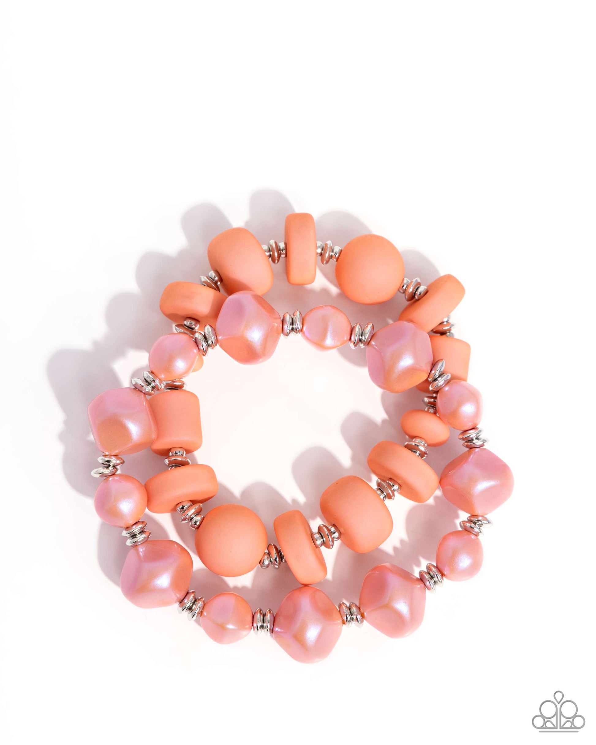 A collection of Desert Flower acrylic beads that alternate with silver beads is stretched across an elastic stretchy band. Joining the acrylic strand, sheared Desert Flower beads brushed with an iridescent sheen also alternate with silver beads along an elastic stretchy band completing a layered, luminescent look. Due to its prismatic palette, color may vary.