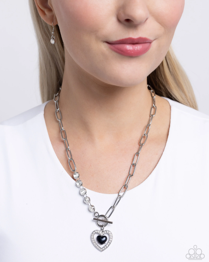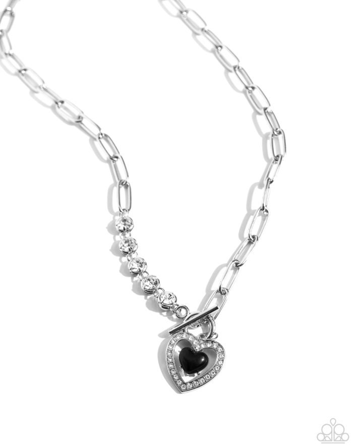 A gleaming black acrylic heart is nestled inside an airy, white rhinestone-encrusted heart frame, creating a charming pendant at the bottom of an exaggerated silver paperclip chain. A quintet of white gems interrupts the silver paperclip chain for additional refinement and shimmer. Features a toggle clasp closure.