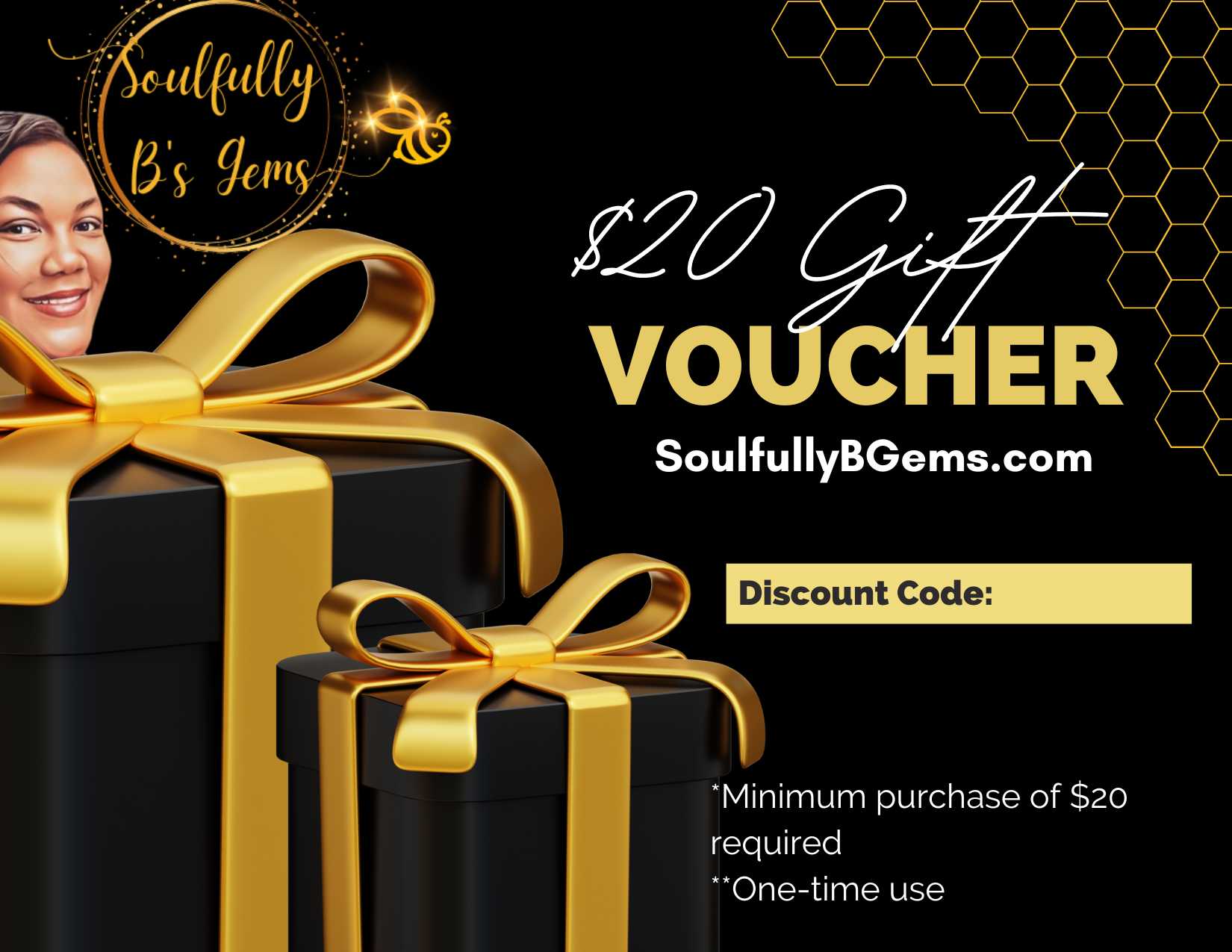 You can receive a gift voucher for Paparazzi jewelry & accessories from Soulfully B's Gems in your chosen amount, sent straight to your email inbox. This voucher allows you to get a discount of the voucher amount off a single purchase of that value or more. For instance, if you have a $20 gift voucher, you can get $20 off a purchase of $20 or more.