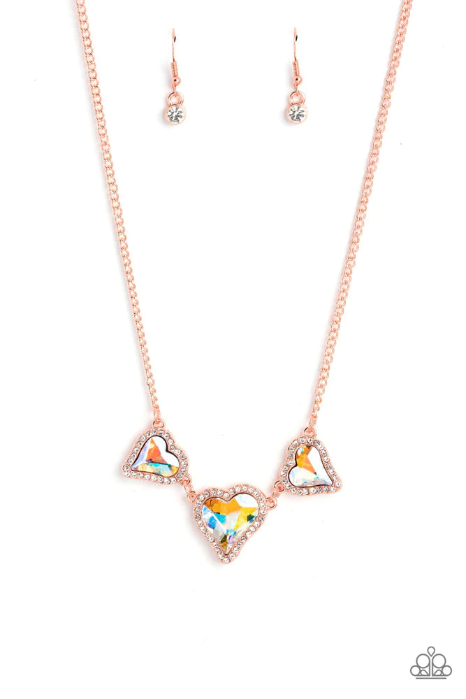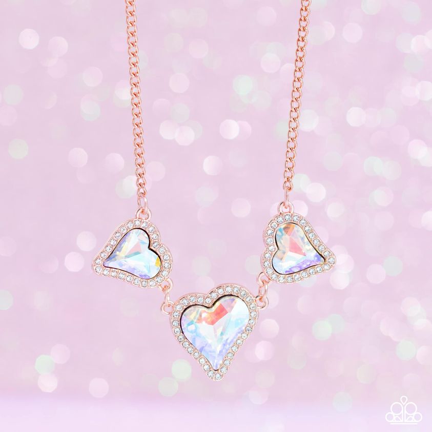 Nestled in white rhinestone frames, a trio of glittery iridescent yellow heart-shaped gems delicately links and dangles down the neckline for a dash of swoon-worthy shimmer on a shiny copper chain. Features an adjustable clasp closure. Due to its prismatic palette, color may vary.