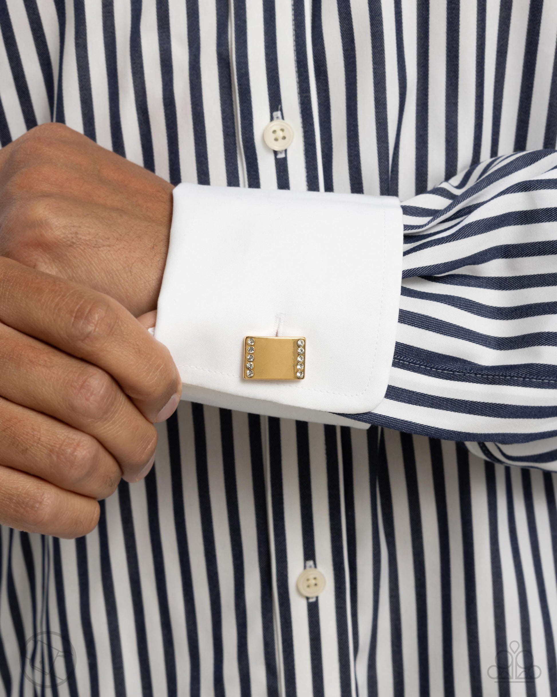Featured on both ends of a rounded rectangular gold fitting, rows of white rhinestones glisten for a boldly balanced cuff link.