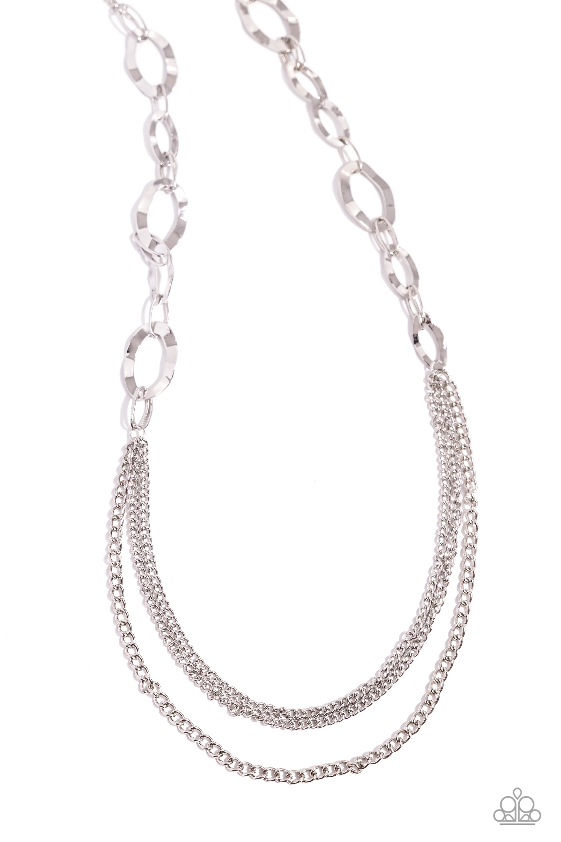Hammered silver rings give way to rows of mismatched silver chains, creating edgy layers down the chest. Features an adjustable clasp closure.