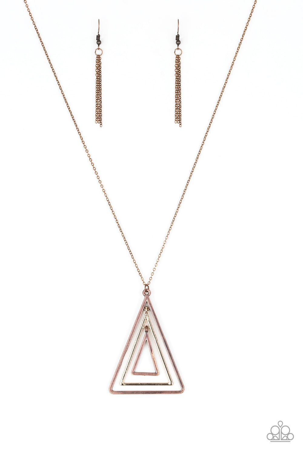 Infused with an elongated copper chain, glistening gold and copper triangular frames layer into a gorgeously stacked pendant for an edgy look. Features an adjustable clasp closure.