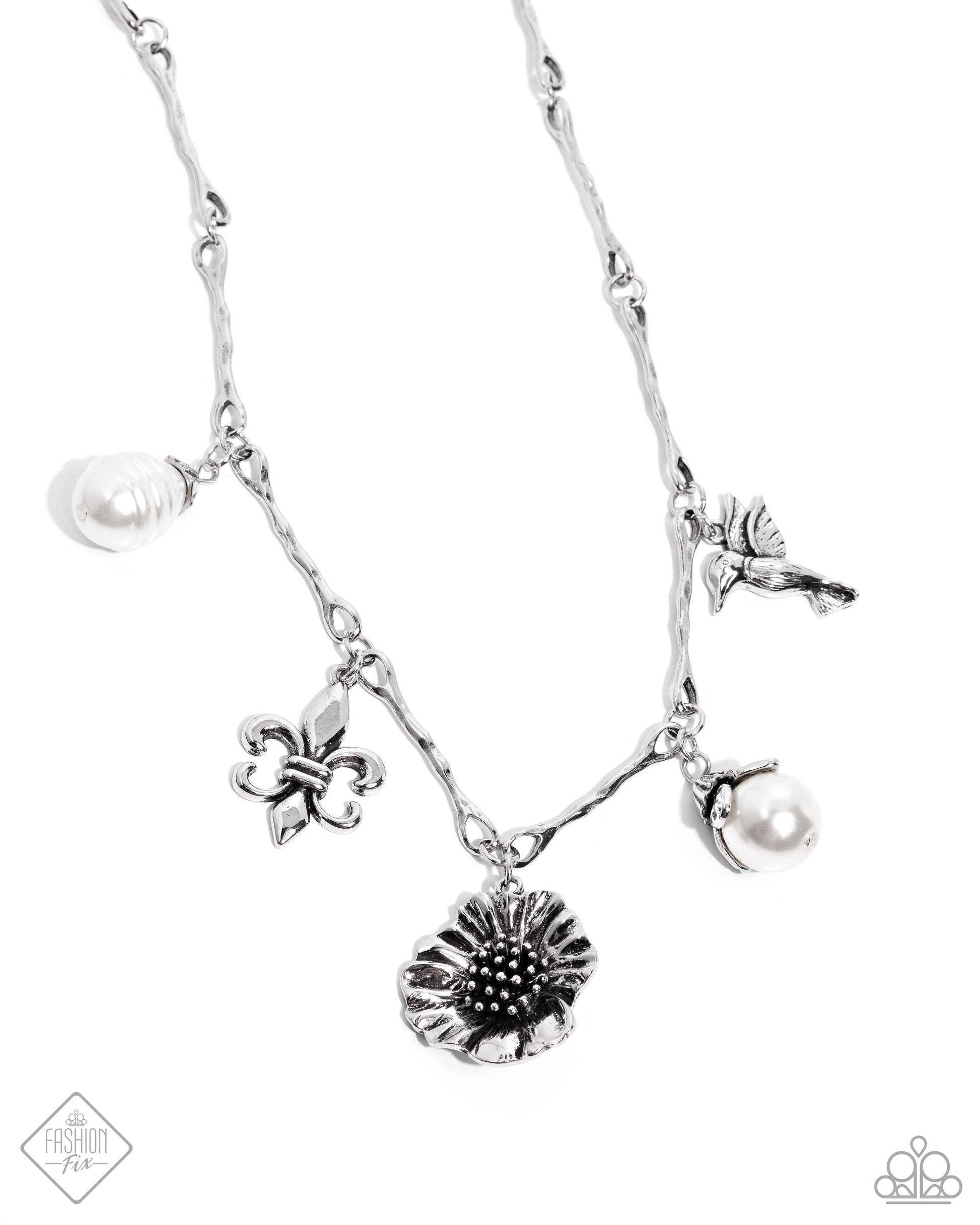 Elongated hammered silver links, connected by dainty silver jump rings, lead down the neckline to a collection of vintage charms, including a baroque white pearl, a silver fleur-de-lis, a silver hummingbird, a silver-studded flower, and a white pearl emerging from textured silver petals. Features an adjustable clasp closure.