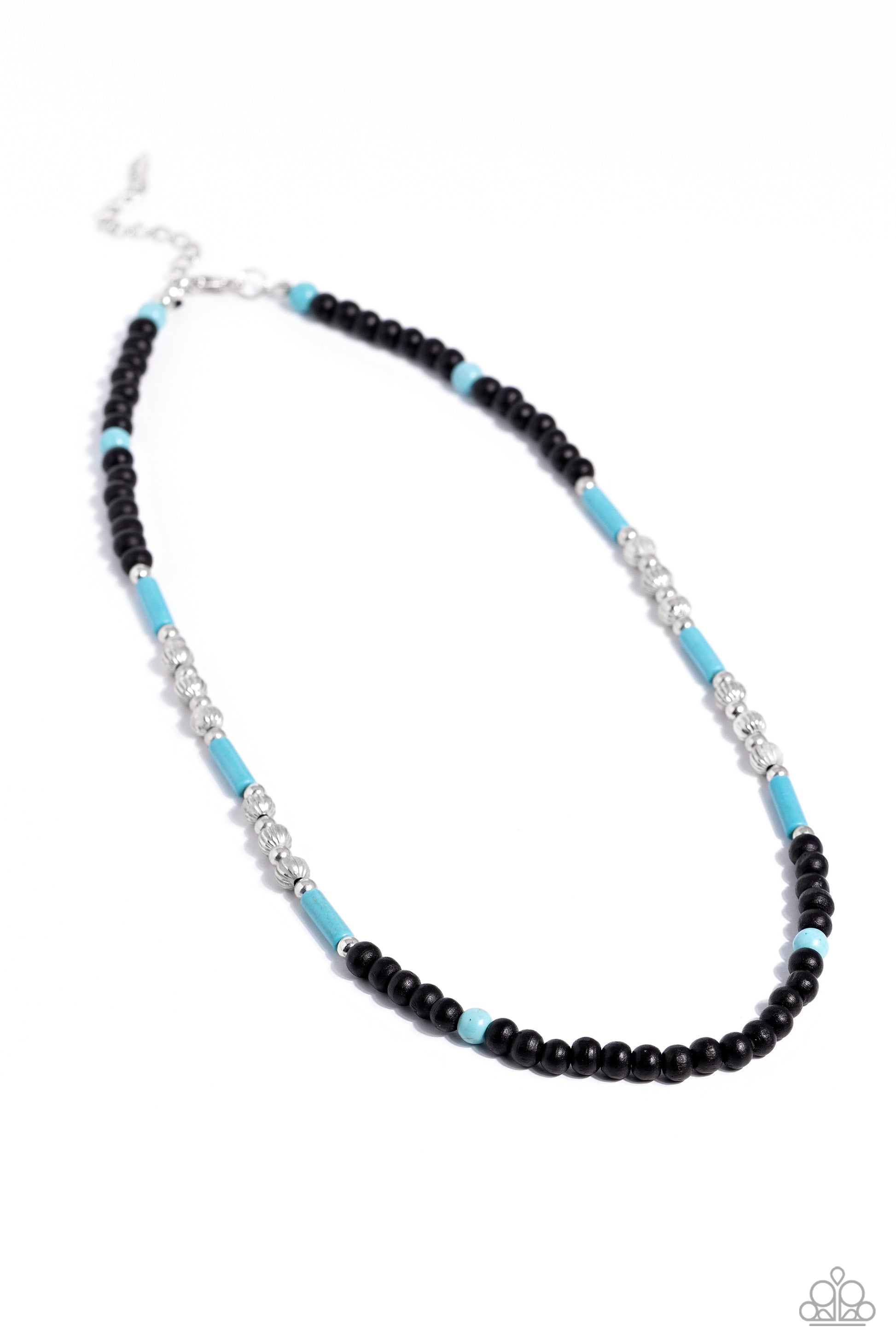 Black wooden beads, striped silver beads, silver studs, turquoise cylindrical stones, and turquoise round stones are threaded along an invisible wire, creating an urban pop of color below the collar. Features an adjustable clasp closure. As the stone elements in this piece are natural, some color variation is normal.