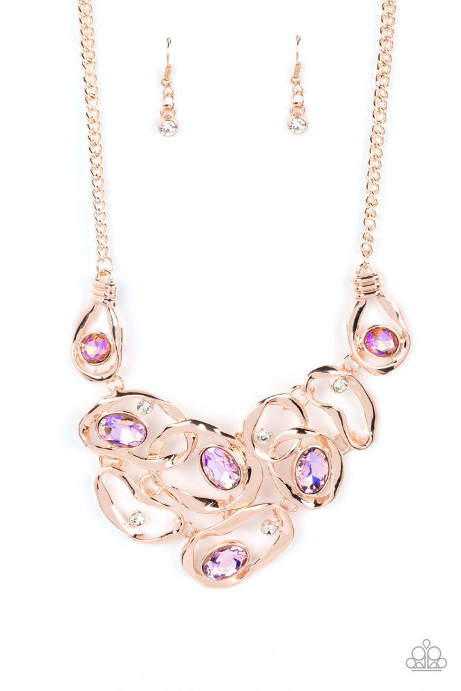 Warped rose gold frames asymmetrically curl around dainty white rhinestones and iridescent peach gem accents, interlocking into a contemporary statement piece below the collar. Features an adjustable clasp closure. Due to its prismatic palette, color may vary.