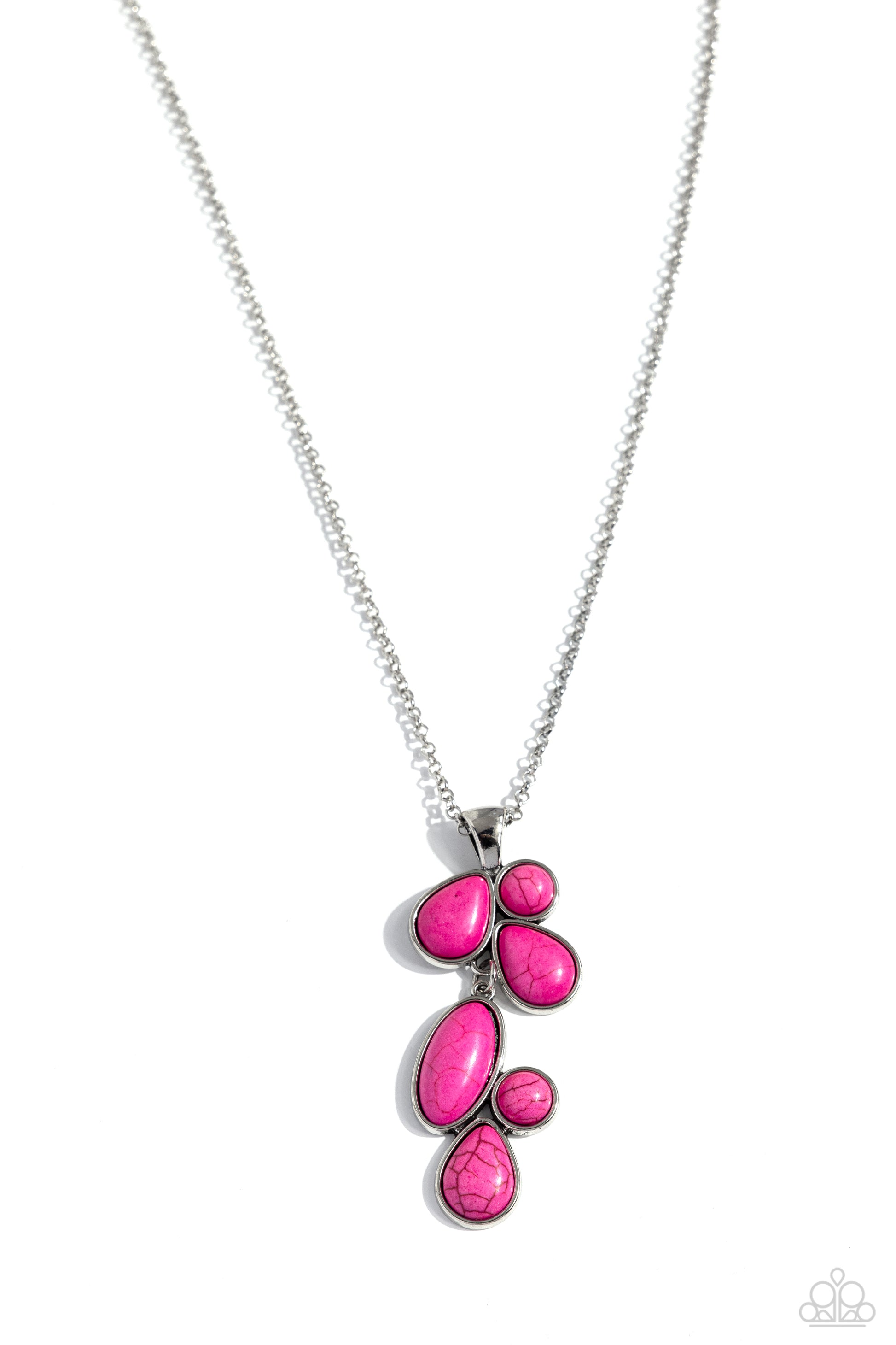 Encased in sleek silver frames, a vivacious collection of pink round, oval, and teardrop frames link into a whimsical pendant at the bottom of an extended silver chain. Features an adjustable clasp closure.